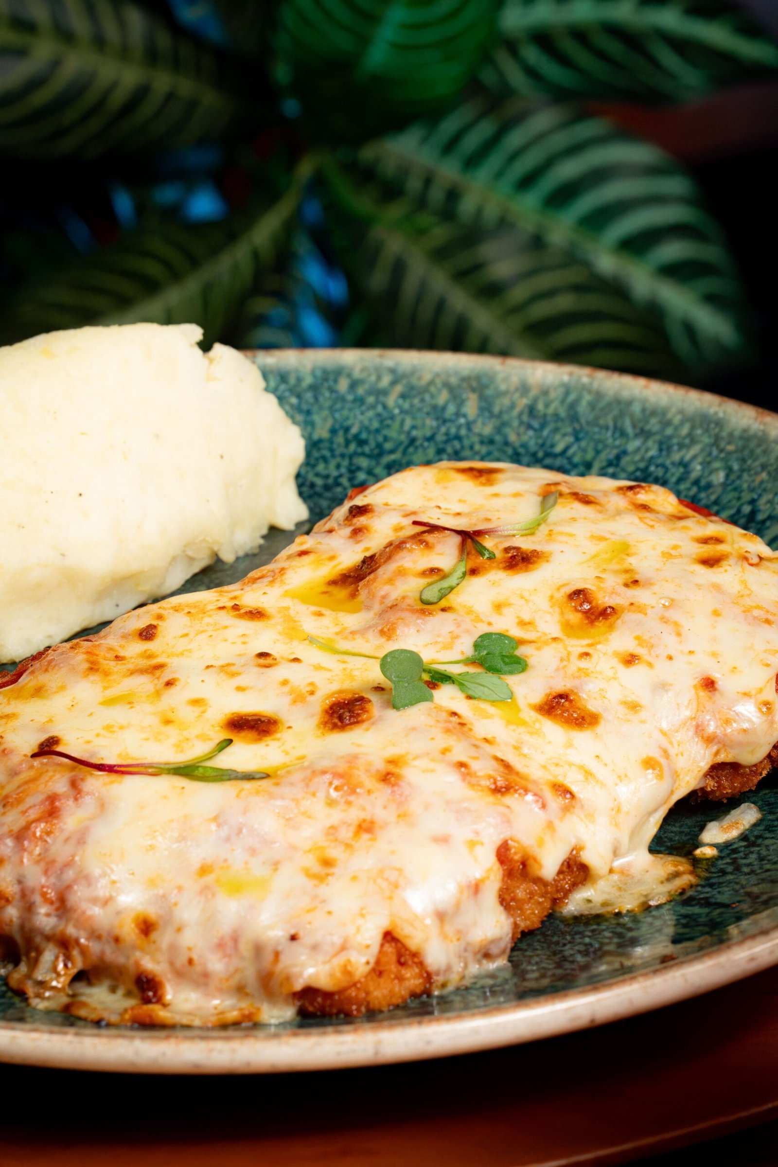 Milanesa de pollo crocante, gratinada con salsa napolitana. Acompañada de papa en casco y ensalada.