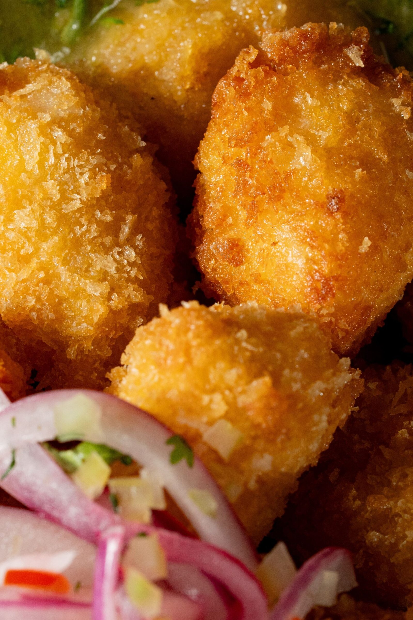 Salmón, pesca del día, camarones y calamar apanados; papa criolla y yuca. Con sriracha mayo y salsa de ají amarillo.