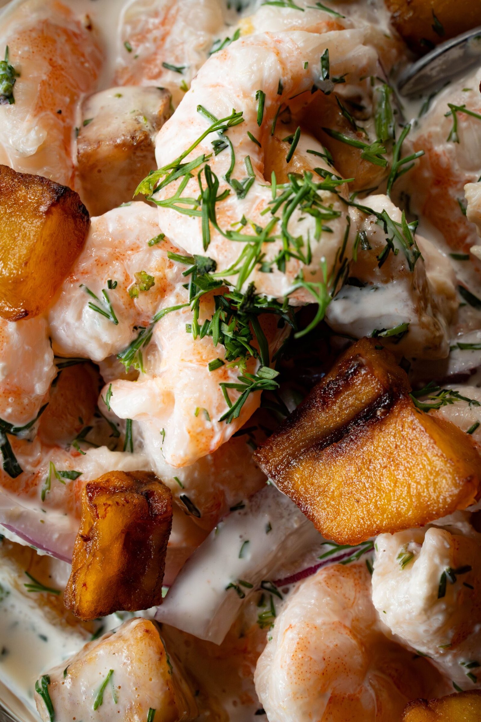 Camarón, cebolla, maduritos con suero y leche de tigre.